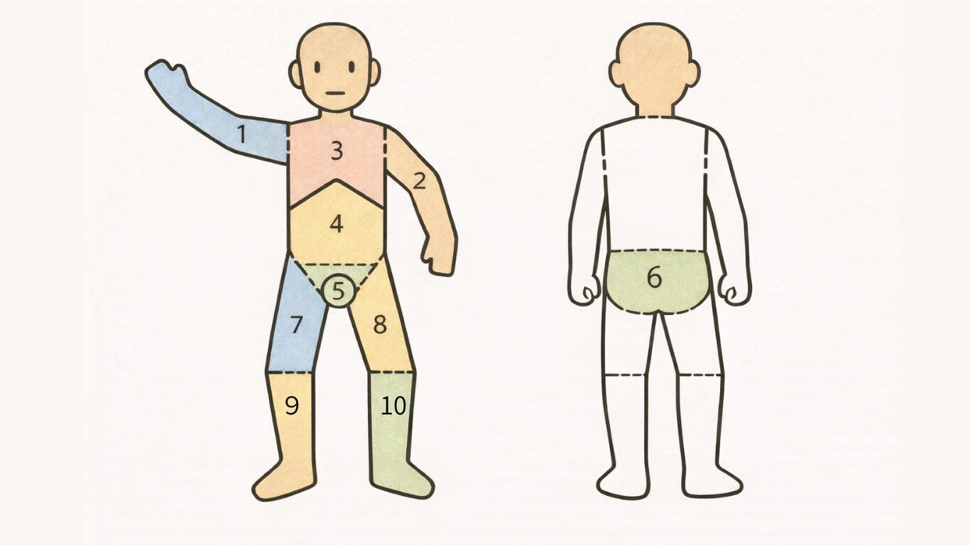 10ヶ所のうち何ヶ所を自分で洗えているかで判断します。